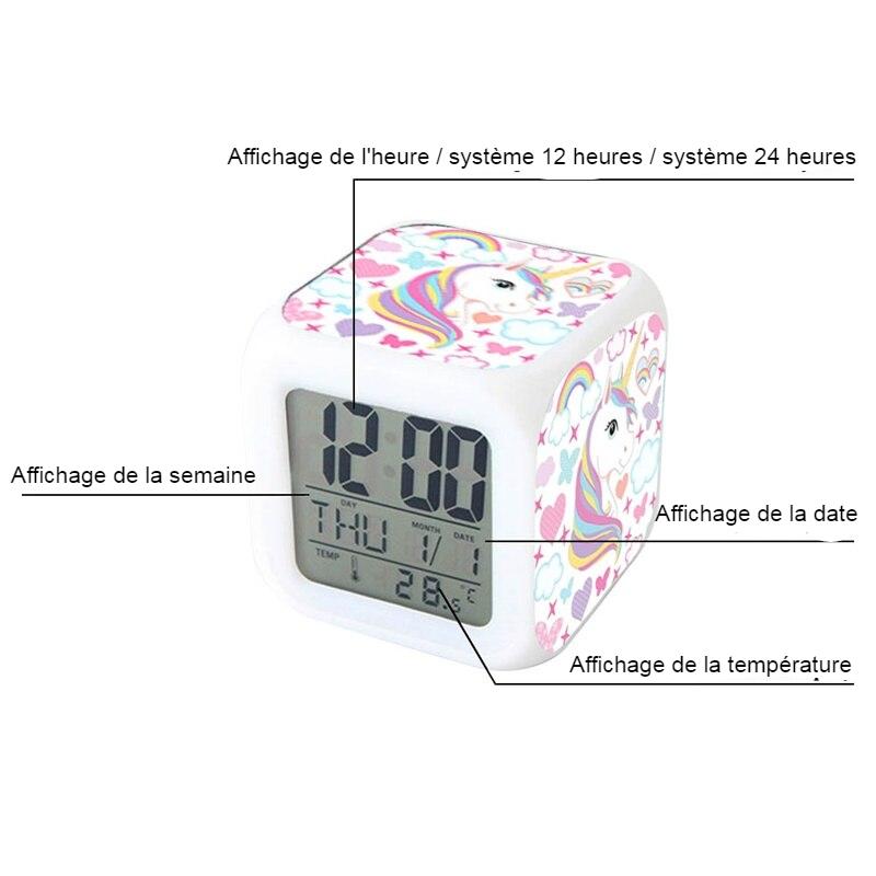 Reloj digital unicornio para niñas sobre una mesa
