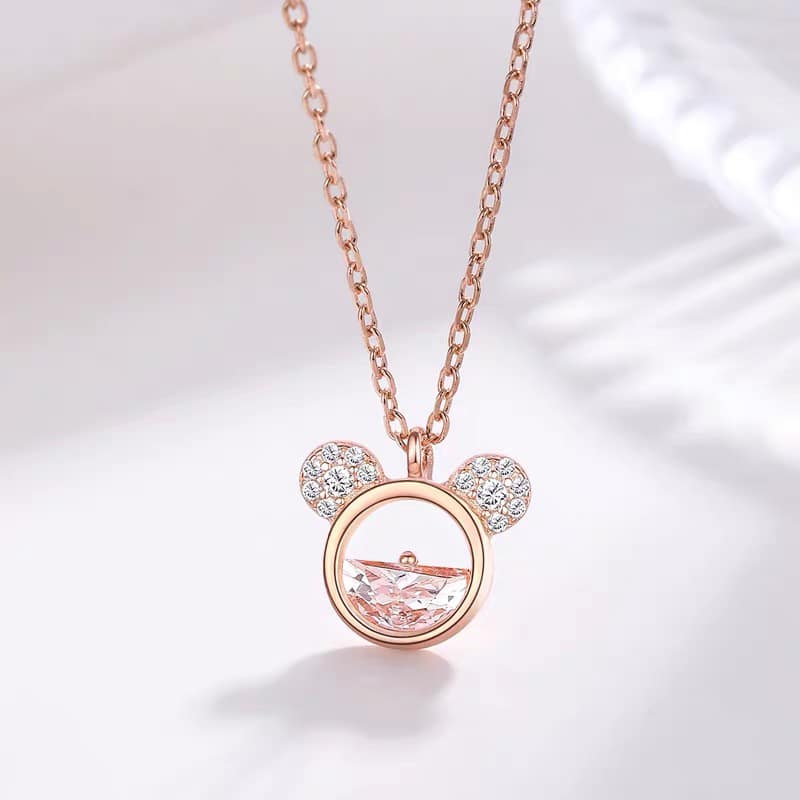 El collar con la forma de la cabeza de Mickey Mouse está adornado con brillantes cristales que añaden un toque de glamour y brillo al conjunto.