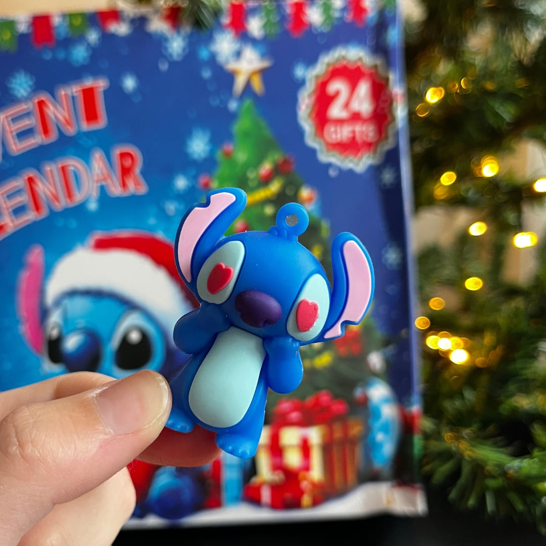 Calendrier de l'Avent Stitch sur fond blanc, avec toutes les figurines disponibles devant la boite