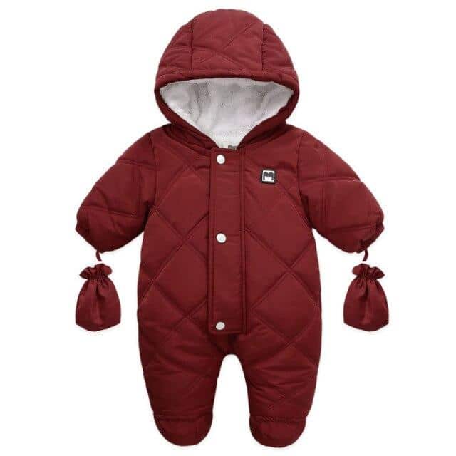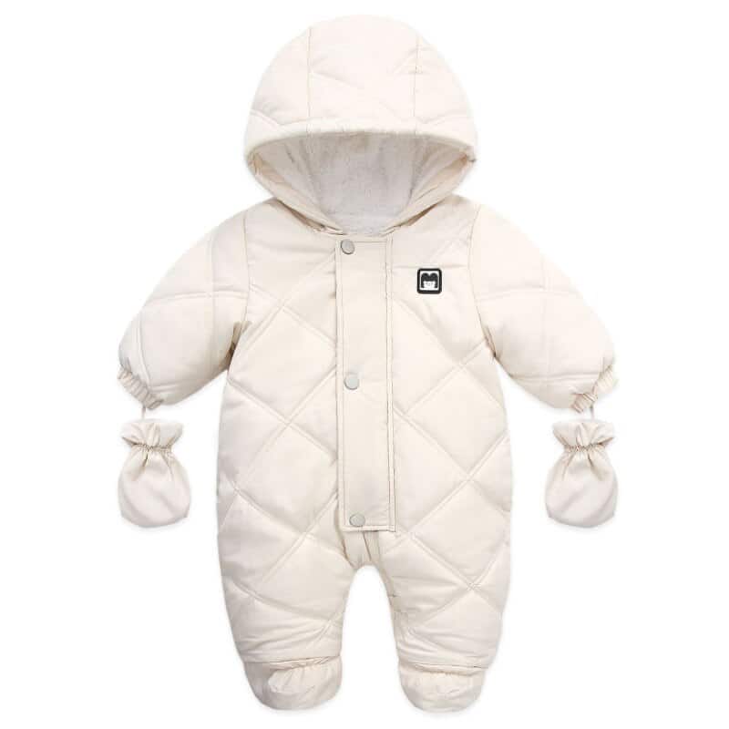 Esta prenda se compone de un cálido y suave conjunto completo de poliéster acolchado, tiene mangas largas e incorpora guantes de manopla para mantener calientes las manos de los niños. La capucha forrada ofrece una protección adicional contra el frío, mientras que la cremallera frontal facilita el vestirse.