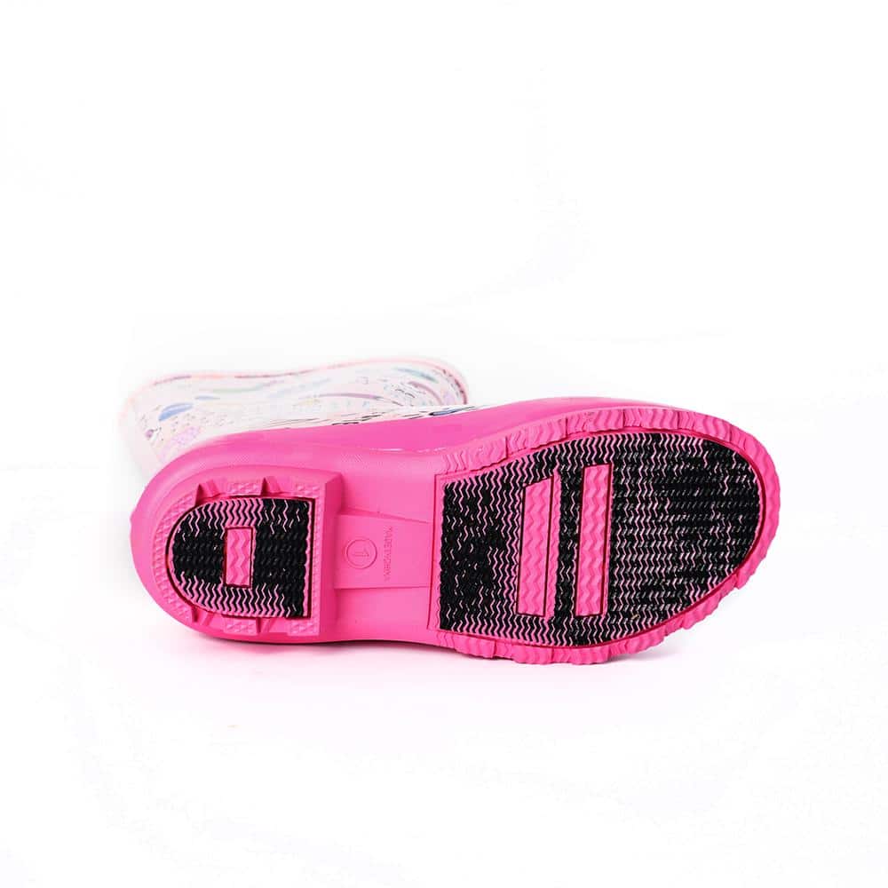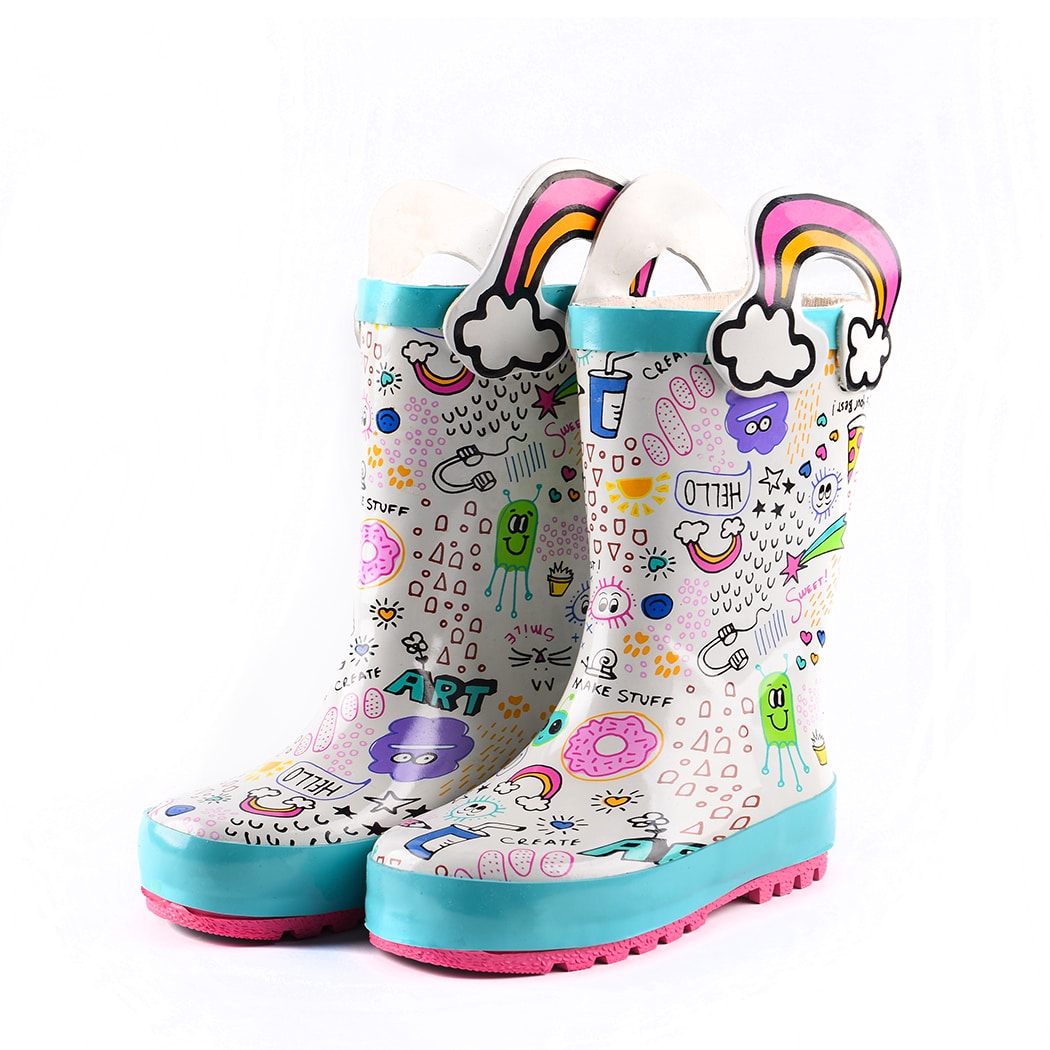 ¡Estas botas de goma para la lluvia son perfectas para mantener los pies de su niña secos y con estilo al mismo tiempo! La bota azul presenta un divertido dibujo del espacio exterior, mientras que la bota rosa tiene un motivo de arte urbano. La bota blanca presenta dos bonitos arcos iris a modo de correas.